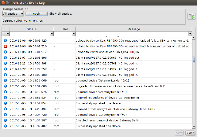 Da die Anzahl dauerhaft gespeicherter Protokolleinträge sehr hoch sein kann, werden beim Öffnen des Dialogfensters nicht alle Einträge automatisch vom mdm-Server geladen. Durch die Änderung der Kriterien unter „Range Selection“ und das Klicken auf „Apply“ werden die für die angegebenen Kriterien passenden Einträge geladen.