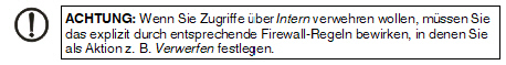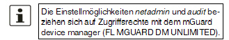 Um Zugriffsmöglichkeiten auf den mGuard differenziert festzulegen, müssen Sie die Firewall-Regeln für die verfügbaren Interfaces entsprechend definieren (siehe „Erlaubte Netzwerke“ auf Seite 51). |