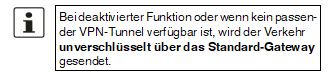 Die Anfrage des NTP-Servers wird, wenn möglich, über einen VPN-Tunnel durchgeführt. Bei aktivierter Funktion wird die Kommunikation mit dem Server immer dann über einen verschlüsselten VPN-Tunnel geführt, wenn ein passender VPN-Tunnel verfügbar ist.