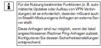 Für die Nutzung bestimmter Funktionen (z. B. automatische Updates oder Aufbau von VPN-Verbindungen) ist es erforderlich, dass der mGuard auch im Stealth-Modus eigene Anfragen an externe Server stellt. Diese Anfragen sind nur möglich, wenn der lokal angeschlossenen Rechner Ping-Anfragen zulässt. Konfigurieren Sie dessen Sicherheitseinstellungen entsprechend. |