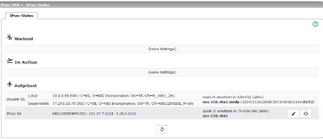 Die ISAKMP SA wurde aufgebaut und die Authentifizierung der Verbindungen war erfolgreich. Verbleibt die Verbindung im Status „Verbindungsaufbau“, stimmten gegebenenfalls andere Parameter nicht: Stimmt der Verbindungstyp (Tunnel, Transport) überein? Wenn Tunnel gewählt ist, stimmen die Netzbereiche auf beiden Seiten überein?