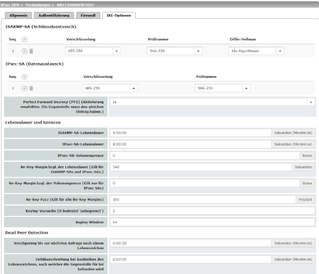 –Damit eine IPsec-Verbindung erfolgreich aufgebaut werden kann, muss die VPN-Gegenstelle IPsec mit folgender Konfiguration unterstützen: