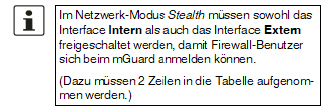 Intern / Extern / Extern 2 / DMZ1 / VPN / Einwahl2 Gibt an, über welche mGuard-Interfaces Firewall-Benutzer sich beim mGuard anmelden können. Für das ausgewählte Interface muss Web-Zugriff über HTTPS freigeschaltet sein: Menü “Verwaltung >> Web-Einstellungen“, Registerkarte Zugriff (siehe „Zugriff“ auf Seite 76)