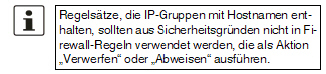 Annehmen bedeutet, die Datenpakete dürfen passieren. Abweisen bedeutet, die Datenpakete werden zurückgewiesen, so dass der Absender eine Information über die Zurückweisung erhält. (Im Stealth-Modus hat Abweisen dieselbe Wirkung wie Verwerfen.) Verwerfen bedeutet, die Datenpakete dürfen nicht passieren. Sie werden verschluckt, so dass der Absender keine Information über deren Verbleib erhält. Namen von Regelsätzen, sofern definiert. Bei Angabe eines Namens für Regelsätze treten die Firewall-Regeln in Kraft, die unter diesem Namen konfiguriert sind (siehe Registerkarte Regelsätze).