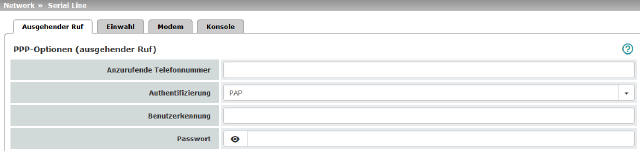 An der seriellen Schnittstelle wird ein externes Modem angeschlossen, das die Verbindung ins Telefonnetz herstellt. Die Anbindung an WAN oder das Internet erfolgt dann (per externem Modem) über das Telefonnetz.