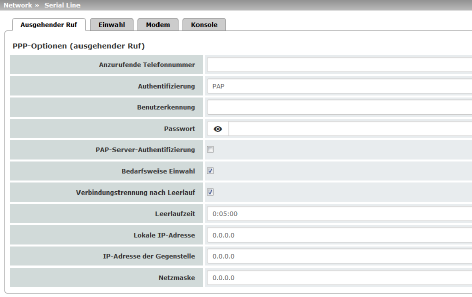 Die Details dazu müssen auf den Registerkarten Allgemein, Ausgehender Ruf, Einwahl und Modem/Konsole konfiguriert werden. Für weitere Erläuterungen zur Nutzungsmöglichkeit der seriellen Schnittstelle (und eines eingebauten Modems) siehe „Modem“ auf Seite 194.