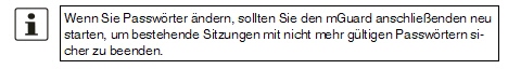 Wenn Sie Passwörter ändern oder Änderungen am Authentifizierungsverfahren vornehmen, sollten Sie den mGuard anschließenden neu starten, um bestehende Sitzungen mit nicht mehr gültigen Zertifikaten oder Passwörtern sicher zu beenden. |