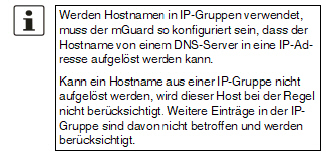 ACHTUNG: Bei der Verwendung von Hostnamen besteht grundsätzlich die Gefahr, dass ein Angreifer DNS-Anfragen manipuliert oder blockiert (u. a. DNS spoofing). Konfigurieren Sie deshalb im mGuard nur vertrauenswürdige und abgesicherte DNS-Server aus Ihrem internen Firmennetzwerk, um entsprechende Angriffe zu vermeiden. IP-Gruppen, die Hostnamen enthalten, sollten aus Sicherheitsgründen nicht in Firewall-Regeln verwendet werden, die als Aktion „Verwerfen“ oder „Abweisen“ ausführen. |