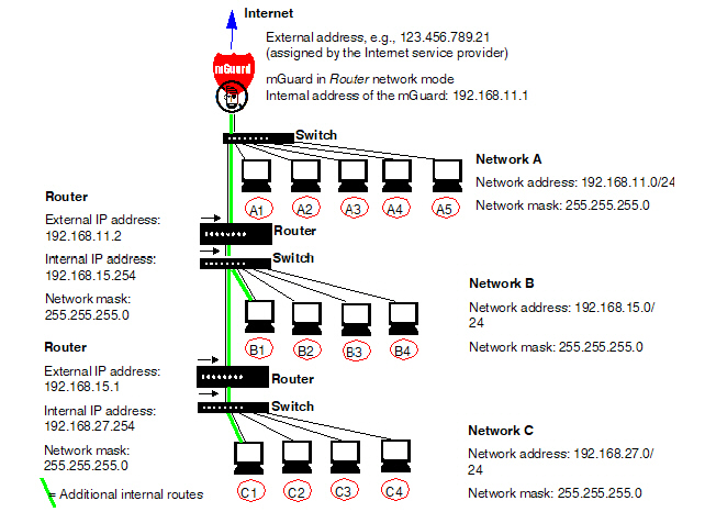 The following diagram shows how IP addresses can be distributed in a local network with subnetworks, which network addresses result from this, and how the details regarding additional internal routes may look for the mGuard.