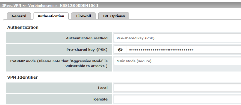 –Authentication using “Pre-shared key” in Aggressive mode is not supported when using “XAuth”/“Mode Config”. If, e.g., a connection from the iOS or Android client to the mGuard server is created, the authentication must take place via certificate.