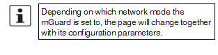 If the mode is set to Router, PPPoE or PPTP and you then change the IP address of the LAN port and/or the local netmask, make sure you specify the correct values. Otherwise, the mGuard may no longer be accessible under certain circumstances. For the further configuration of Built-in mobile network modem / Built-in modem / Modem network mode, see "Dial-out" on page 174. |
