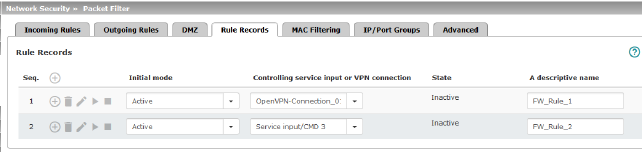 A rule record – and thus all the firewall rules configured in it – could, for example, be controlled via an on/off switch or an established VPN connection (see "Management >> Service I/O" on page 114).