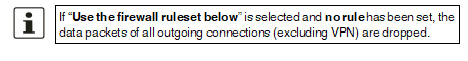 Accept all connections: the data packets of all outgoing connections are allowed. Drop all connections: the data packets of all outgoing connections are discarded. Accept Ping only: the data packets of all outgoing connections are discarded, except for ping packets (ICMP). Use the firewall ruleset below: displays further setting options. |