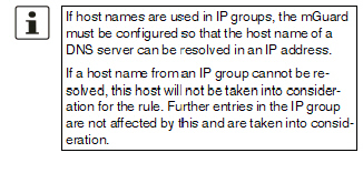 Host names can also be specified in IP groups in addition to IP addresses, IP areas, and networks (DNS-based firewall rules). IP address resolution of host names is performed according to the DNS settings of the mGuard . This allows host names to be used in firewall groups via IP groups (see "IP/Port Groups" on page 273).