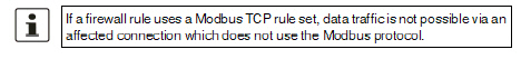 Name of Modbus TCP rule sets, if defined. When a Modbus TCP rule set is selected, the firewall rules configured under this rule set take effect (see "Modbus TCP" on page 282). |